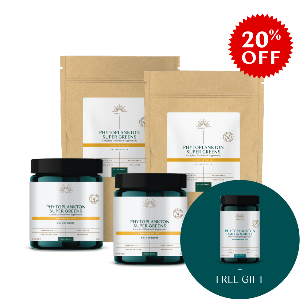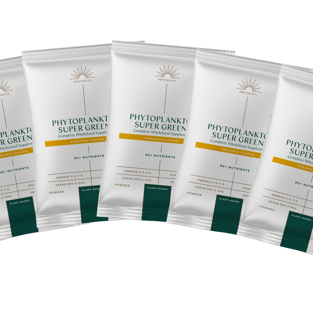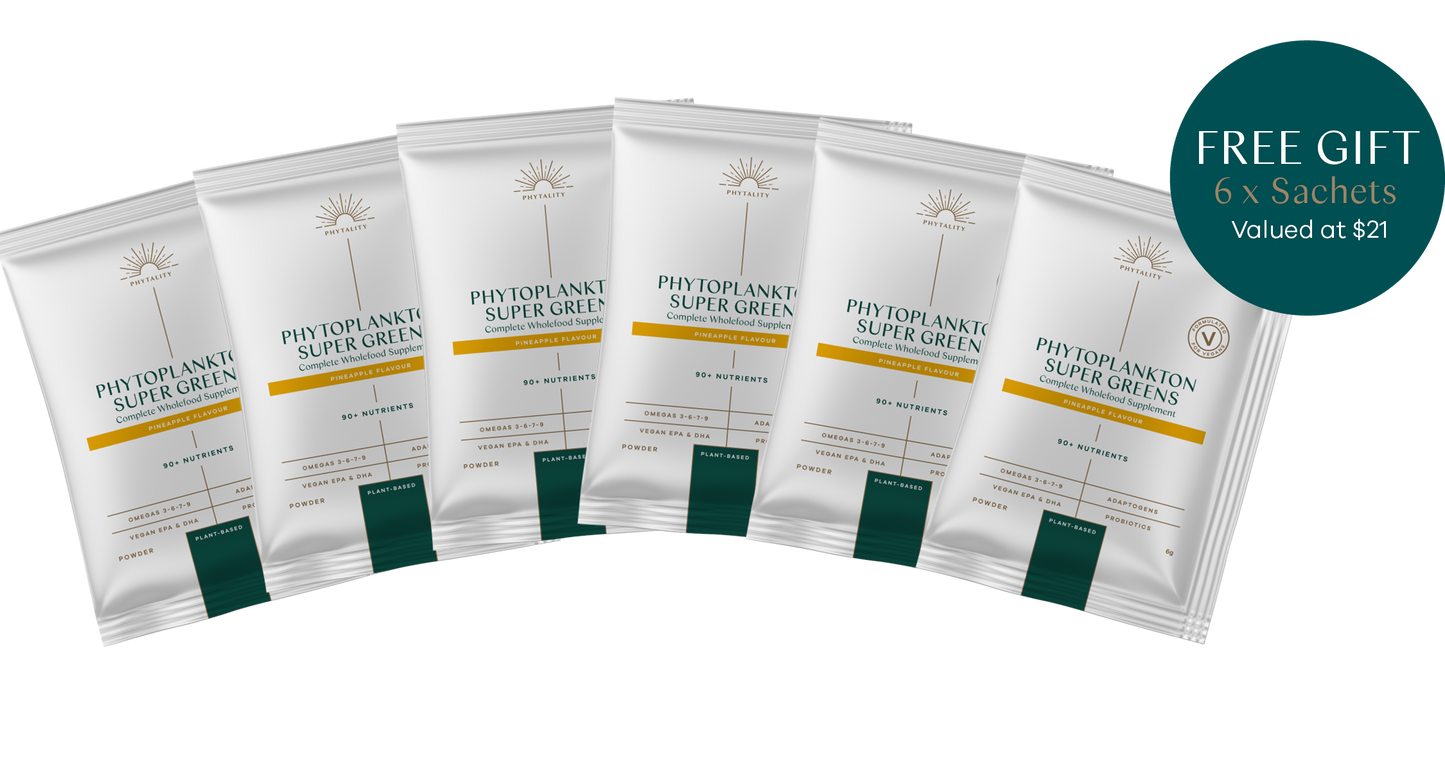 Phytoplankton Super Greens is a delicious pineapple-flavoured blend of alkaline superfoods, antioxidants, probiotics, and ULTANA™ Phytoplankton, promoting gut health, energy, mental clarity, and reduced stress.