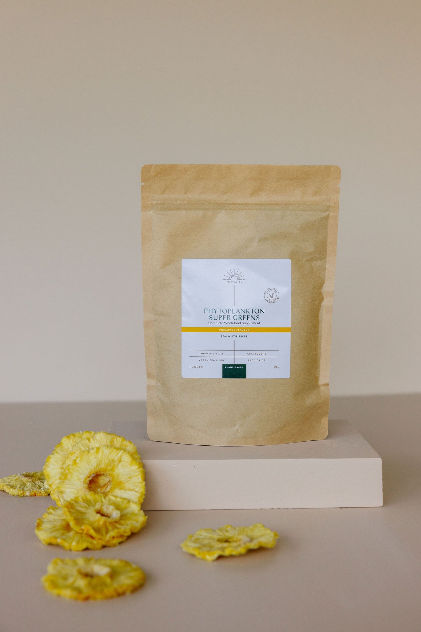 Delicious pineapple-flavoured superfood blend with 190mg essential fatty acids per serve. Complete nutrition formula with alkaline superfoods, probiotics, and adaptogens.