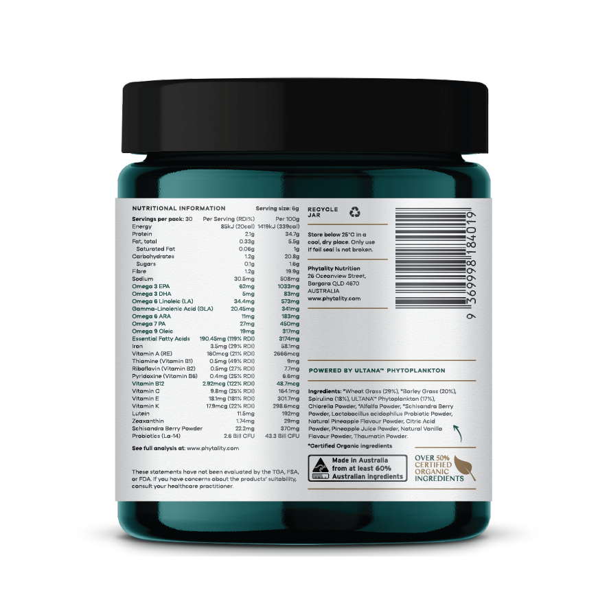 Wheatgrass (29%), Barley grass (20%), Spirulina (18%), ULTANA Phytoplankton (17%), Chlorella, Alfalfa, Schisandra berry powder, Probiotics (Lactobacillus acidophilus), Natural pineapple flavour, Citric acid, Pineapple juice powder, Natural vanilla flavour powder, Thaumatin powder