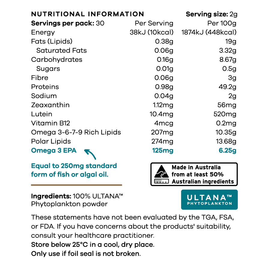 Our unique ULTANTA signature blend of Phytoplankton delivers EPA rich omega-3s with superior absorption, plus complete plant-based nutrition including all essential amino acids, omegas 3,6,7 + 9, natural vitamin complex including B12, & over 75 trace minerals.